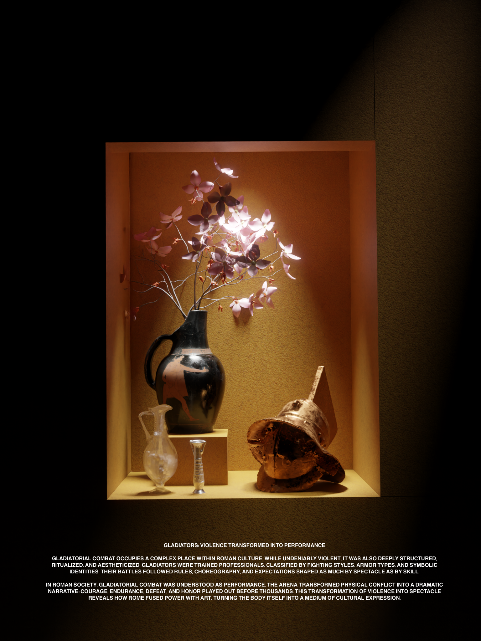 This corridor represents life beneath the stage — the world of performers, gladiators, animals, and ritual preparation. It is not documentary; it is experiential and symbolic.